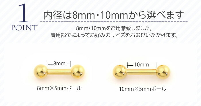 ゲージ 12G カラー 4色よりお選びいただけます 内径 8mm/10mmよりお選びいただけます ボールサイズ 5mm 素材 サージカルステンレス ※素材について こちらのアイテムはサージカルステンレスとなっておりますが、 ゴールドやブラック、ピンクゴールド等はサージカルステンレスの上にカラーのメッキコーティングを施しています。